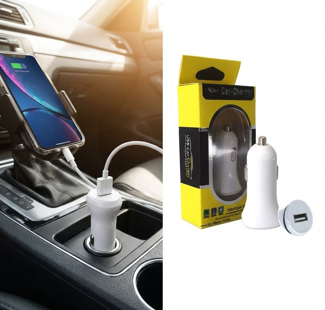Cargador de auto universal ACS002 para toma de encendedor, con salida USB de 1A en color blanco. Ideal para mantener cargado el celular y otros dispositivos de bajo consumo durante los recorridos diarios, como solución práctica y compacta dentro del vehículo.