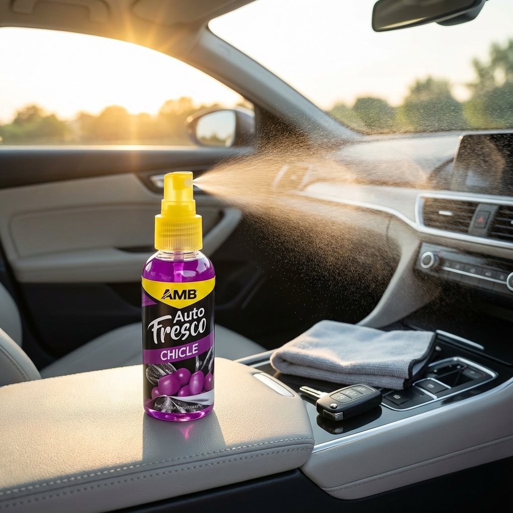 AML106 / AML108 / AML109 AMB AUTO FRESCO SPRAY 100ML son ambientadores en spray de 100 ml para automóvil, disponibles en fragancia chicle (morado), carro nuevo (azul) y fresa (rosado). Ideales para eliminar malos olores y dejar el interior del vehículo con un aroma fresco y agradable, gracias a su práctico atomizador que permite aplicar la fragancia de forma rápida y controlada.