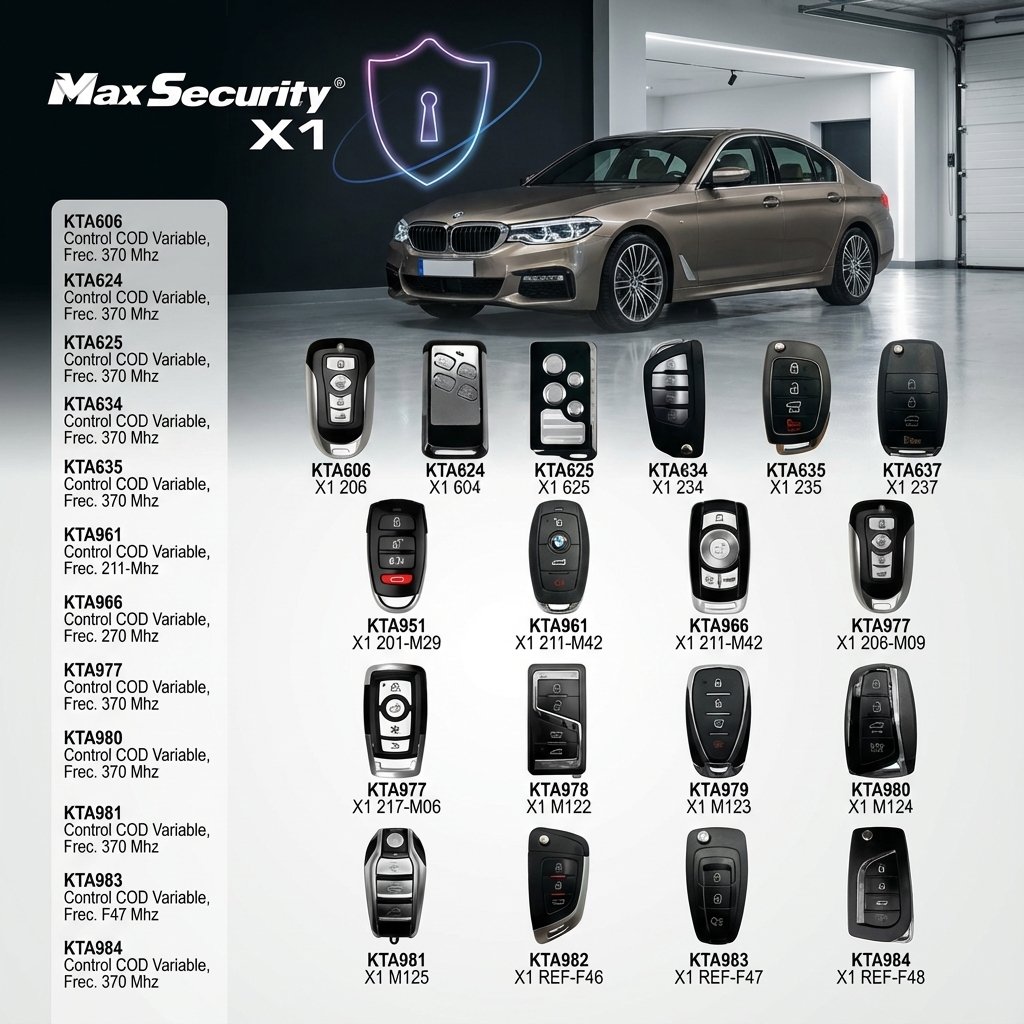 Control Remoto Alarma Max Security X1 Código Variable Diseños Variados. Transmisores de repuesto originales con tecnología anti-clonación. Disponibles en múltiples diseños y frecuencias (principalmente 370 Mhz, con variaciones como 211 Mhz y 270 Mhz). Compatibles exclusivamente con la línea X1. Elige tu diseño favorito entre las referencias KTA606, KTA977, KTA980 y muchas más.