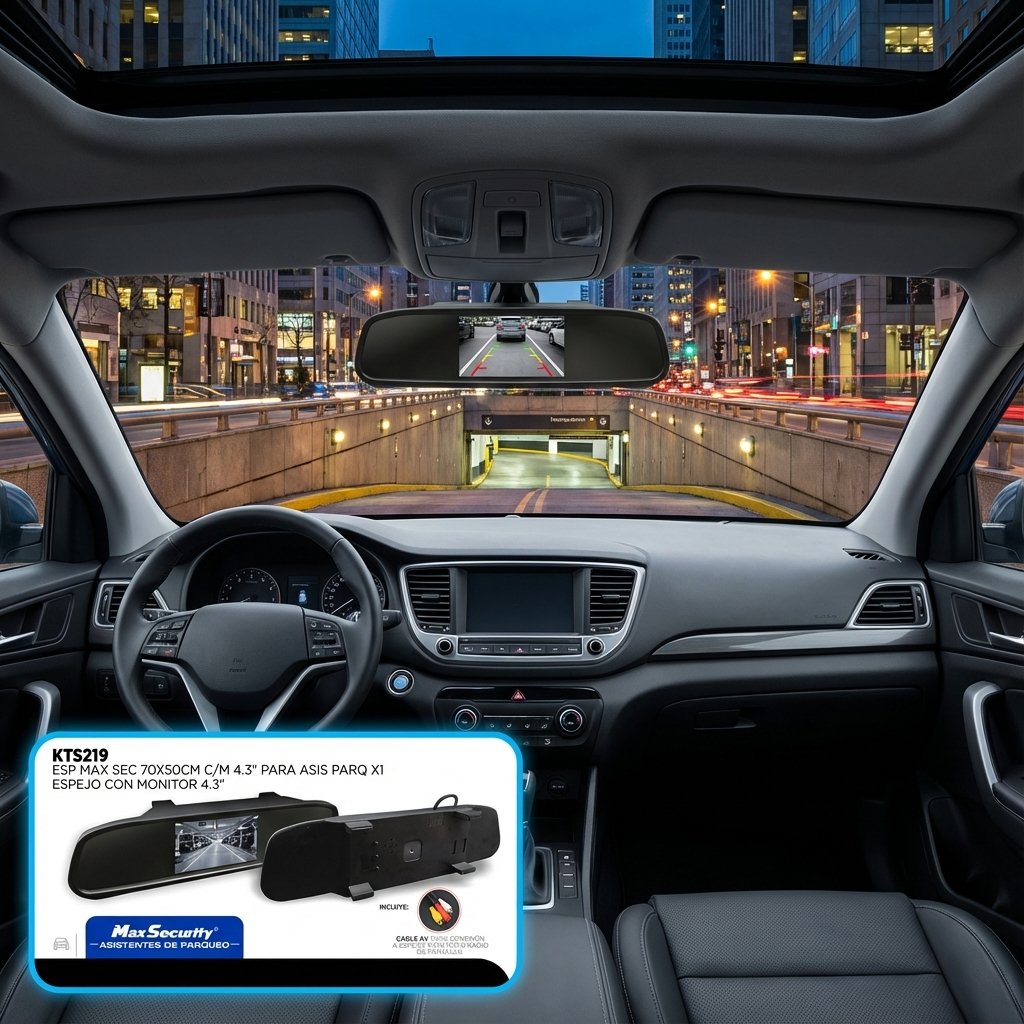 Espejo Retrovisor con Monitor 4.3 Pulgadas. Convierte tu espejo tradicional en una pantalla de asistencia de parqueo. Este dispositivo se instala fácilmente sobre el espejo original de tu carro gracias a sus clips ajustables. Cuenta con pantalla LCD de 4.3″ oculta que se activa con la reversa. Compatible con todas las cámaras RCA y sistemas de 12V.