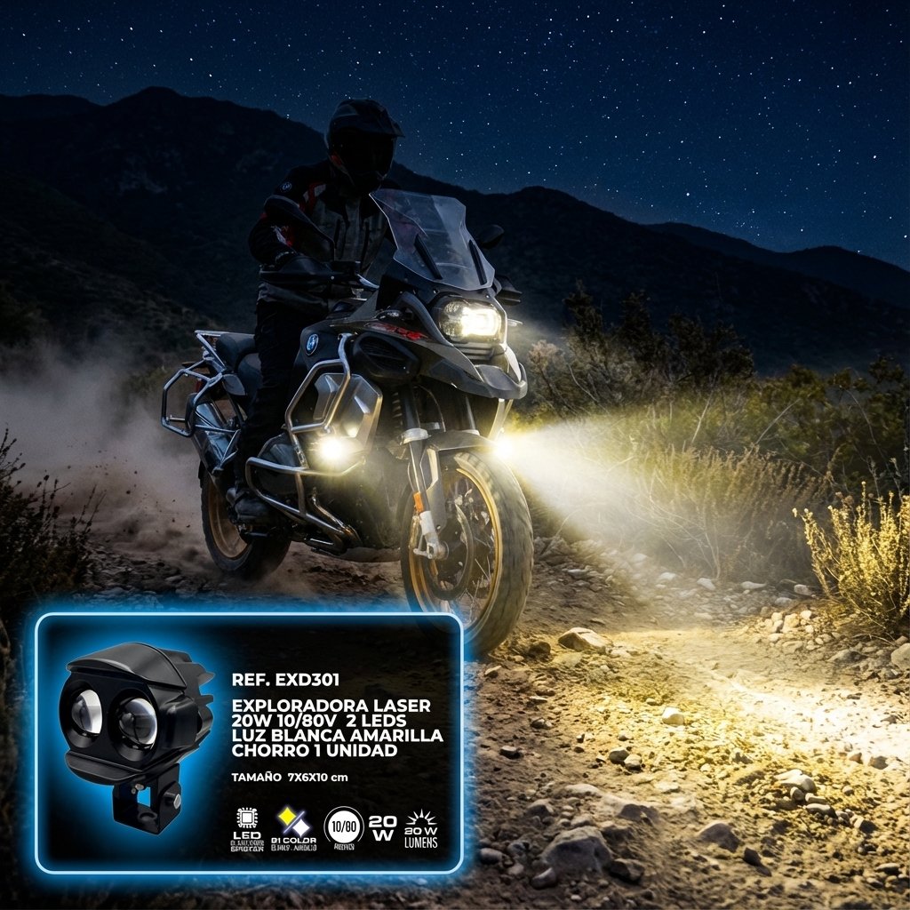 Exploradora Laser LED 20W Bi-Color 10/80V. Unidad compacta de alta versatilidad con doble lente proyector. Ofrece 20 Watts de potencia con función Bi-Color (Blanca/Amarilla) para adaptarse al clima. Destaca por su amplio rango de voltaje de 10V a 80V, haciéndola perfecta para motos, eléctricos y maquinaria. Incluye 1 unidad.