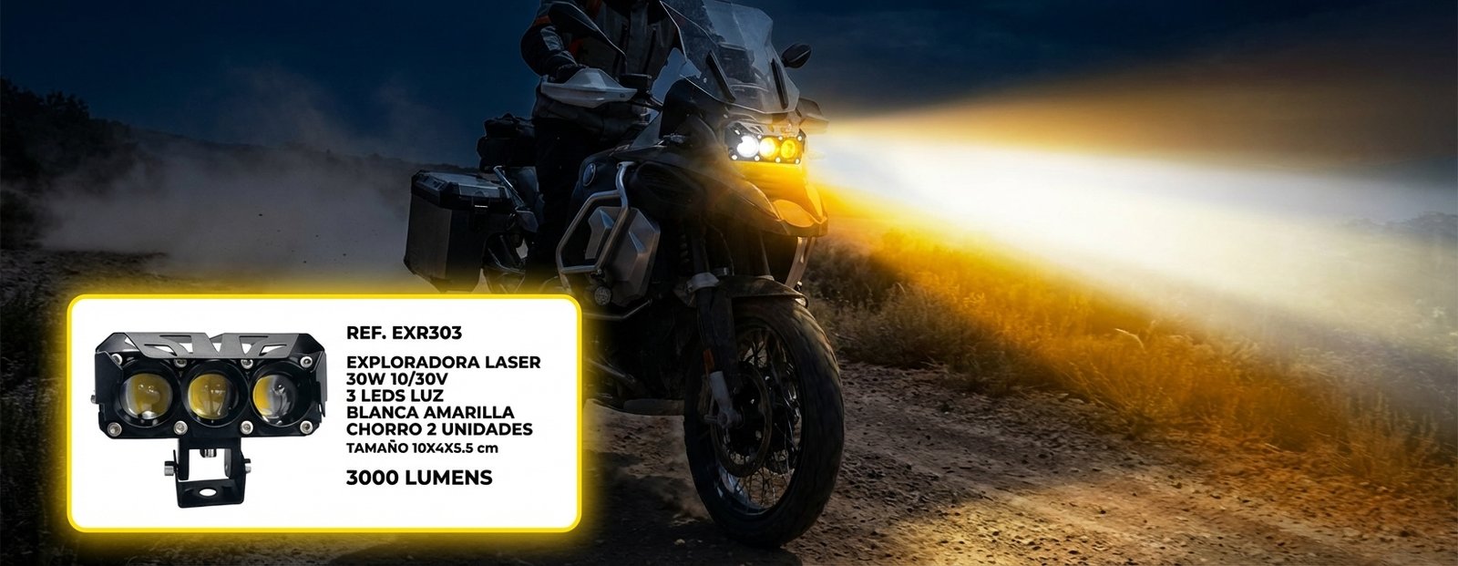 Par Exploradoras Laser LED 30W Bi-Color. Kit de 2 unidades compactas ideales para motos y vehículos 4×4. Ofrecen 3000 lúmenes con función dual: luz blanca para profundidad y amarilla para niebla. Equipadas con 3 LEDs Epistar de alta intensidad, funcionan a 10/30V y tienen un tamaño de 10cm, perfecto para instalaciones discretas pero potentes.