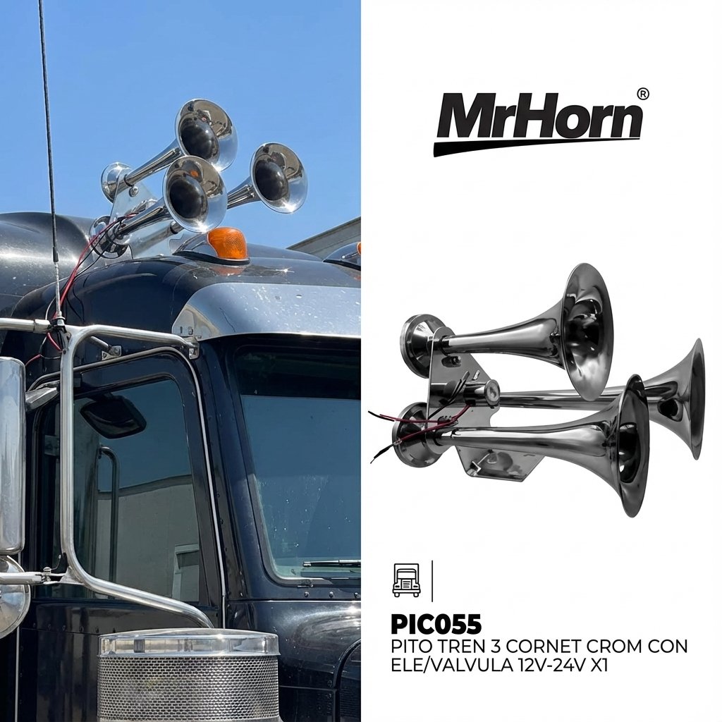 Pito tipo tren PIC055 con 3 cornetas cromadas y electroválvula integrada, diseñado para sistemas eléctricos de 12V y 24V. Ideal para camiones, buses, pick-ups y vehículos personalizados que requieren una señal sonora extremadamente potente y llamativa, similar a la de un tren, para mayor seguridad y presencia en carretera.