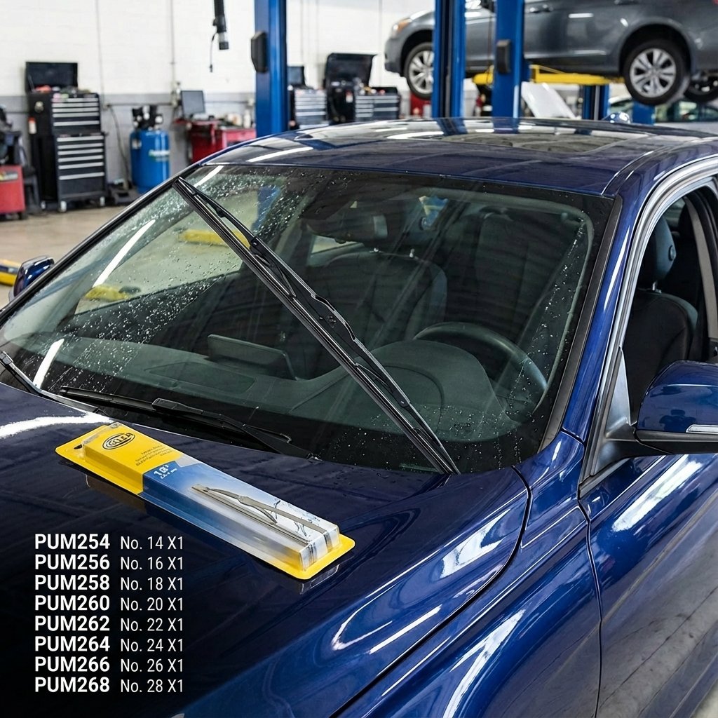 La línea incluye diferentes referencias y medidas —PUM254, PUM256, PUM258, PUM260, PUM262, PUM264, PUM266 y PUM268— que cubren longitudes aproximadas desde 14″ hasta 28″, lo que permite ajustarse a una amplia variedad de modelos de vehículos. Cada plumilla viene empacada de forma individual y está pensada como reemplazo directo de escobillas desgastadas que dejan vetas, zonas sin limpiar o ruido al funcionar.