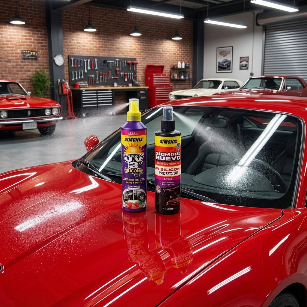 Los Protectores de Silicona Simoniz para Interiores y Exterior son sprays a base de silicona que devuelven brillo y protección a plásticos, vinilos y llantas del vehículo. Se aplican fácilmente con atomizador y paño suave, dejando un acabado brillante y ayudando a cuidar las superficies contra polvo, humedad y sol.